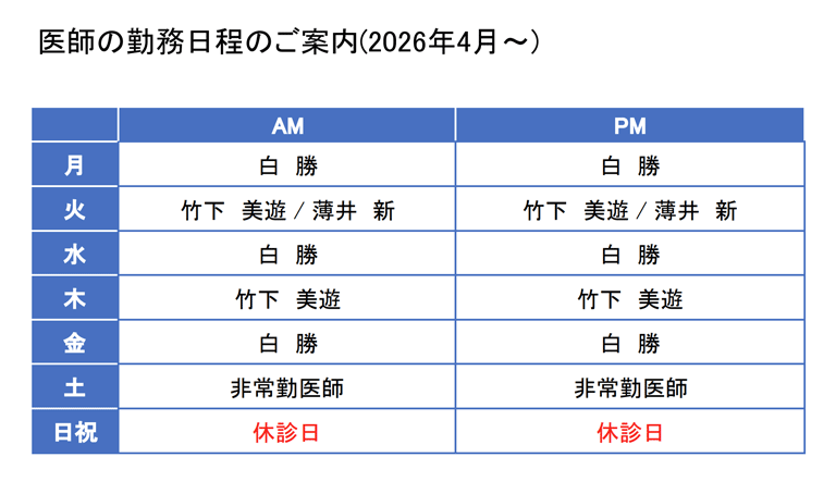 令和8年4月より、下記の通り医師の勤務日が変更となります。