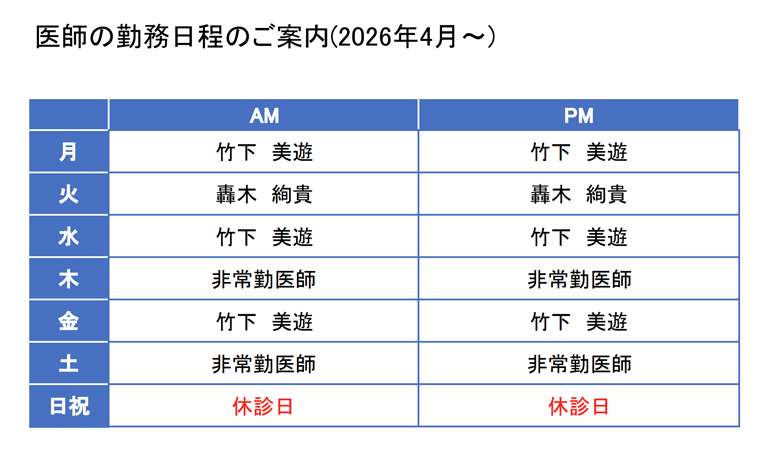 令和8年4月より、下記の通り医師の勤務日が変更となります。 これに伴い、診療内容や実施可能な注射の種類が一部変更となる場合がございます。 患者様にはご不便をおかけいたしますが、何卒ご理解とご協力のほどよろしくお願い申し上げます。