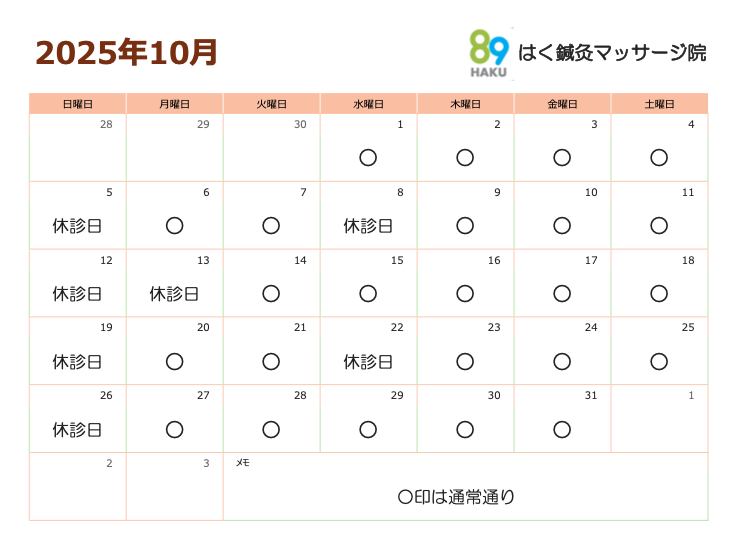 はく鍼灸マッサージ院2025年10月休診日のお知らせ